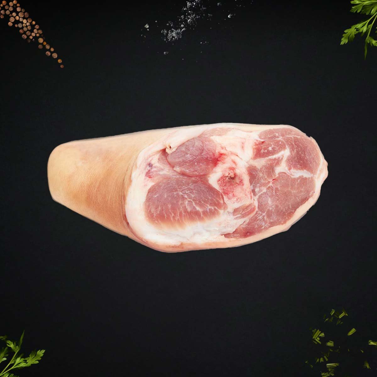 Flavorful bone-in pork leg sustainably sourced from free range pigs that live outdoors in natural family farms. Fed a vegetable diet with no hormones or drugs added, this premium cut of pork roasts to falling-off-the-bone tenderness or bra
