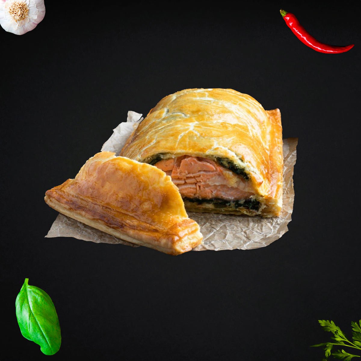 Our Salmon Wellington wraps a succulent salmon fillet in a rich, creamy sauce, all encased in a flaky, golden pastry. This gourmet dish is guaranteed to impress at any dinner party or special occasion. The weight is approximately 2 kilograms.